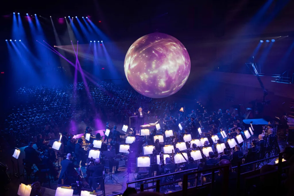 Au centre de cette superbe grande salle remplie jusqu’au troisième balcon, une énorme boule de Noël tournait de tous ses feux au-dessus de nos têtes, illustrant les dires de Fred Pellerin.