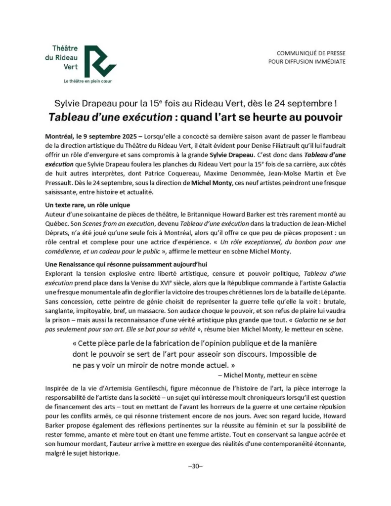 Le Théâtre du Rideau Vert débute sa 77e saison avec panache : Sylvie Drapeau incarnera la peintre Galactia pour sa 15e présence au Rideau Vert, dans Tableau d’une exécution, un rôle soigneusement choisi pour elle par Denise Filiatrault avant que cette dernière ne passe le flambeau de la direction artistique de l’institution à Benoit McGinnis.